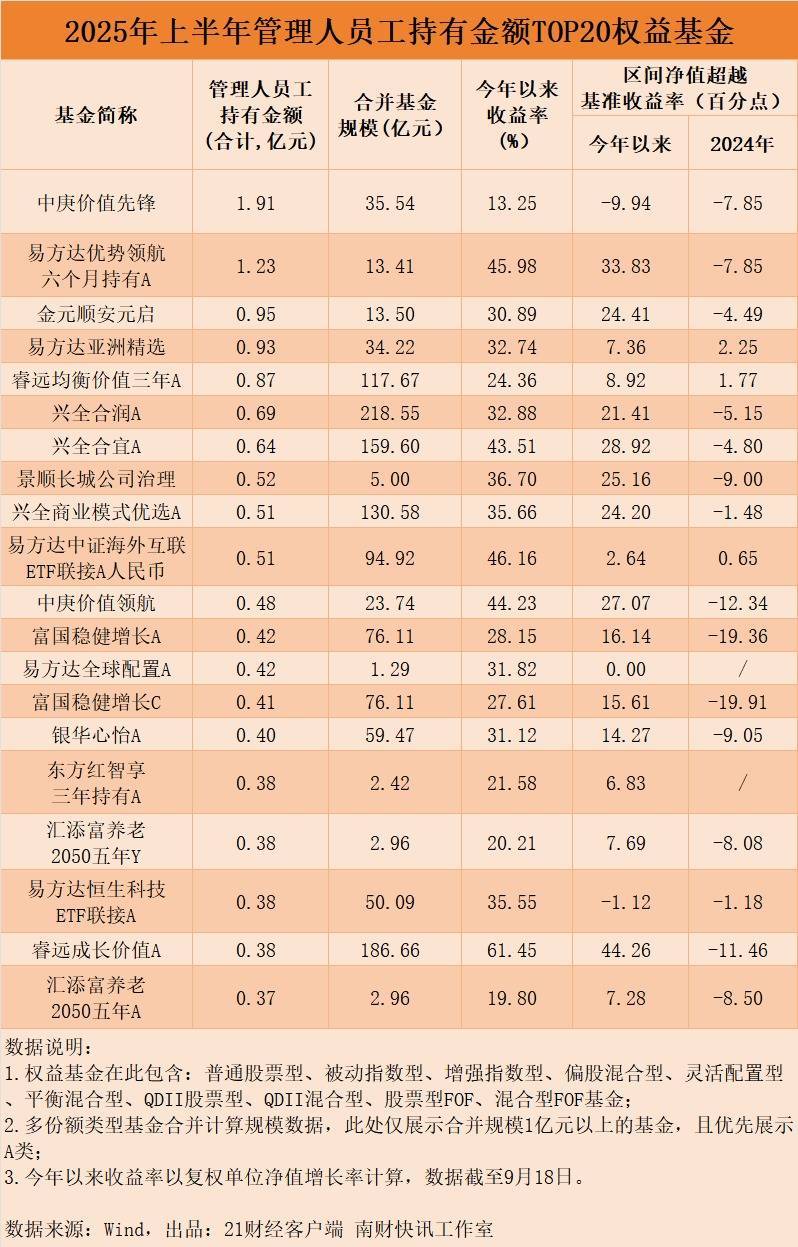 2025年上半年管理人员工持有权益基金情况看管理人员工持有金额:“内部人”产品风格偏好各异从基金公司员工持有金额来看,易方达、兴证全球、中庚、睿远等基金公司旗下的多只产品备受“自己人”青睐。而在产品风格方面,榜单前列中产品风格各异,有的深度布局价值策略,有的灵活捕捉市场机遇。