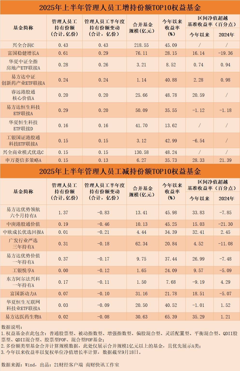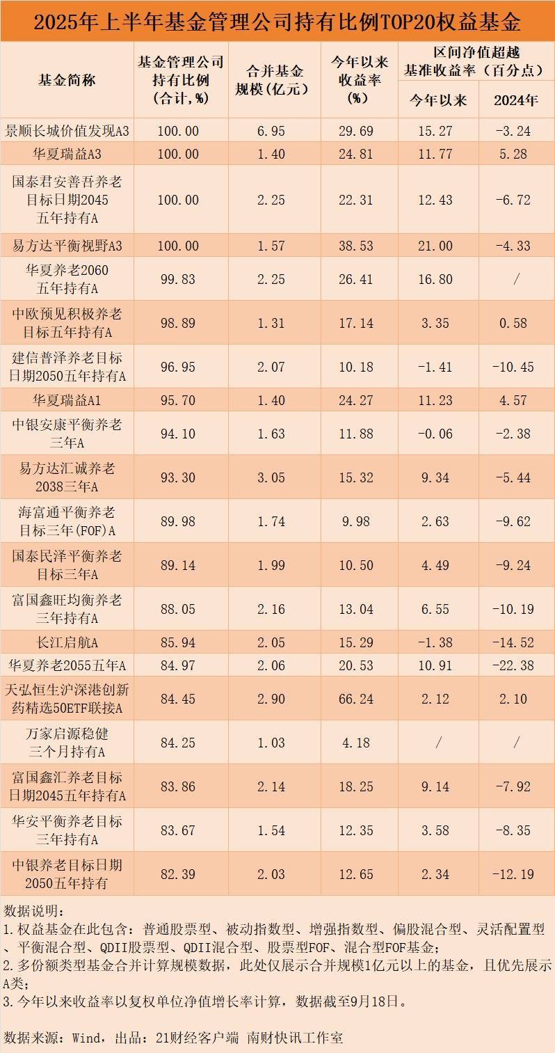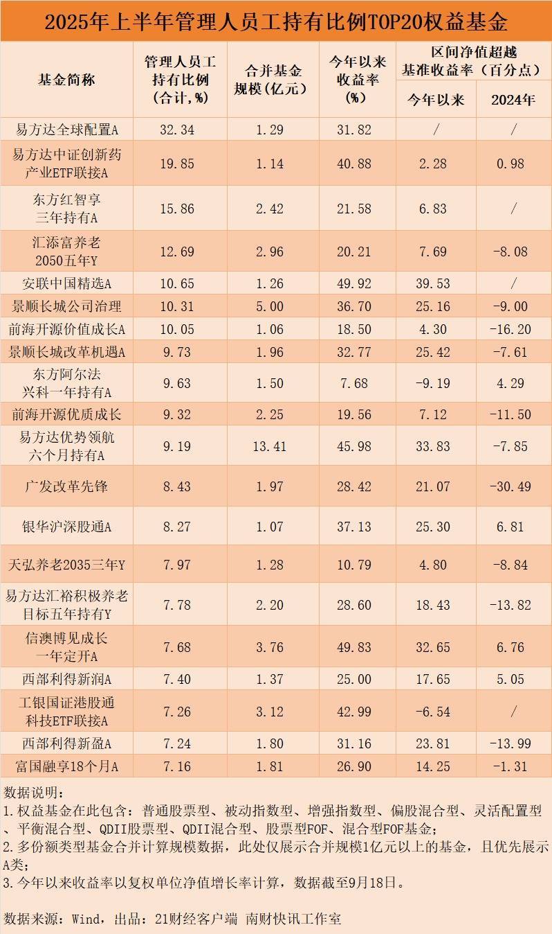 看管理人员工持有比例:“稳健派”与“成长派”并重上半年,员工持有比例居前20位的权益基金整体呈现规模偏小的特征,多数产品规模不足2亿元。从业绩表现来看,相较于2024年全年,榜单中多数基金今年以来业绩跑赢基准的幅度实现显著提升。从具体的产品选择来看,“内部人”中既有追求均衡配置的“稳健派”,也有偏好高景气赛道的“成长派”。