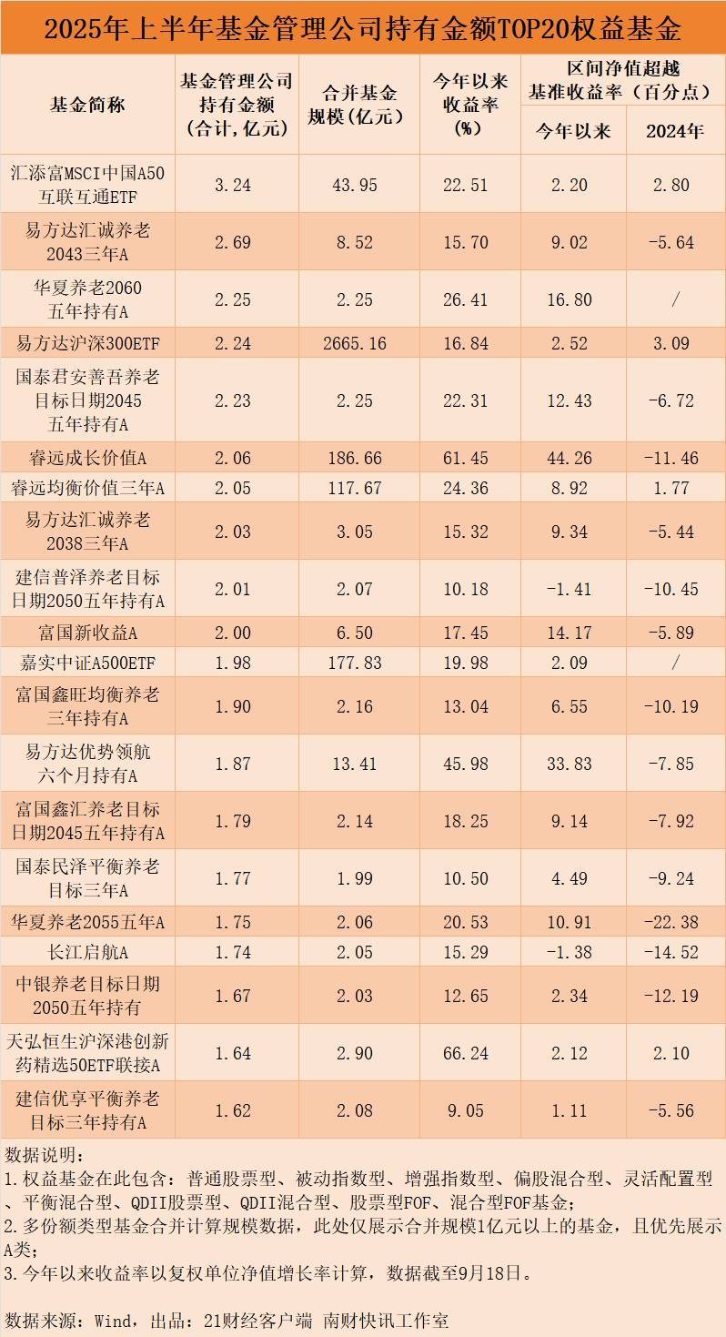 2025年上半年基金管理公司持有权益基金情况看基金管理公司持有金额:真金白银投向旗下养老基金从基金管理公司持有金额来看,多只养老FOF得到了自家基金公司真金白银的支持。易方达汇诚养老2043三年A、华夏养老2060五年持有A等多只产品,位列基金管理公司持有金额最高的20只权益基金前列。