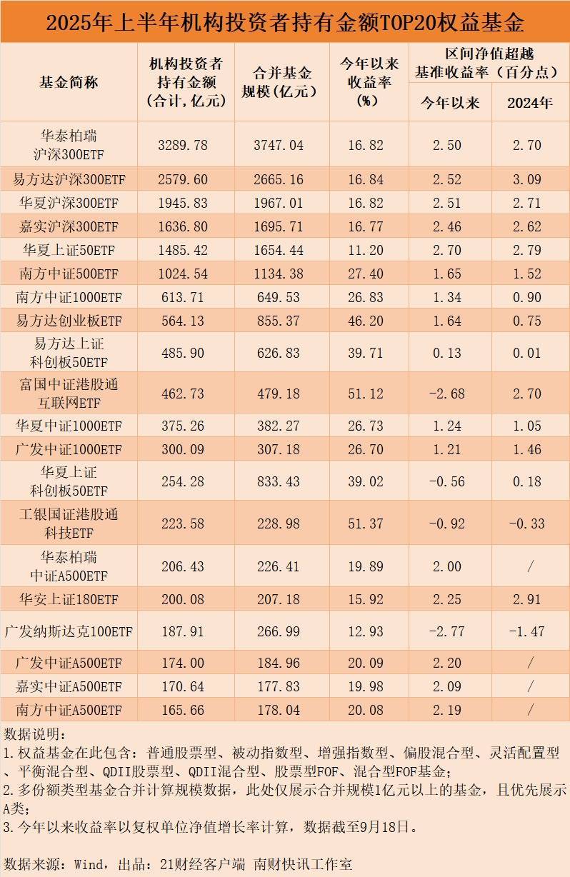 2025年上半年机构投资者持有权益基金情况看机构投资者持有金额:机构重金“押注”沪深300ETF2025年上半年,宽基ETF成为机构们重金持有的主流。截至上半年末,机构投资者持有金额最高的20只权益类基金均为ETF产品,且宽基ETF占据绝大多数。